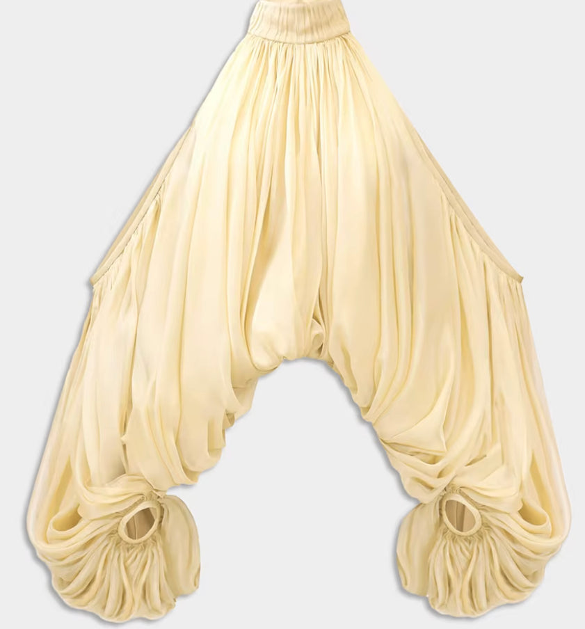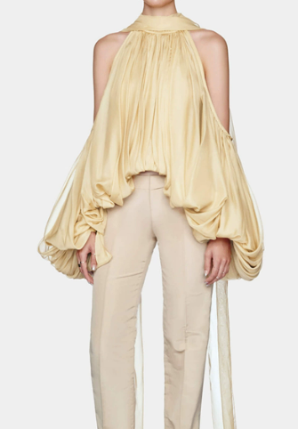 Die dramatisch inszenierten Drapierungen umhüllen den Körper wie ein Hauch von Luxus und kreieren bei jeder Bewegung eine neue Dimension von Eleganz. Die luftigen Öffnungen an den Schultern und die fließenden, ballonartigen Ärmel sorgen für ein raffiniertes Spiel zwischen Haut und Stoff – ein Ausdruck femininer Stärke und zeitloser Extravaganz.